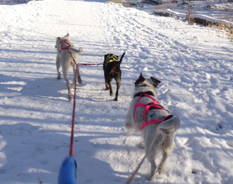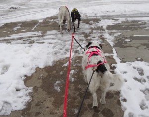 So anyway, out we went, just canicrossing around the block at first. I was in no way ready to hook all 3 dogs up to the scooter, and it had snowed and become treacherously icy by the time I had ordered and received the gangline anyway.