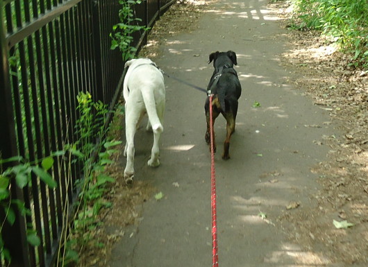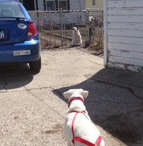 It’s a bit hard to see, and yes I realize my garage needed to be painted, but I’m standing in the alley and Pip and Maisy are in the yard acting as the teases to get Squash to line out towards them. Later, when I started taking Squash and Maisy to the state park to scooter, I hooked them up to my trunk latch and that made it much easier to really work on it because I could get in front of them. Maisy still likes to turn around and look at me, which can result in tangles, but they’re getting it down pretty well.