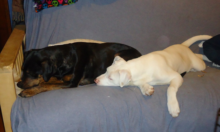 I realized that while I didn’t have an experienced sled dog, I did have Maisy. Teaching a dog to walk nicely on a leash has never been my greatest strength as a dog owner/trainer anyway, but Maisy and I battled her incorrigible pulling pretty much from the day she came home until the day I first wondered if maybe she could help me out with Squash. The more I thought about it, the better the idea seemed… because not only did she pull, but Squash adored her thusly: