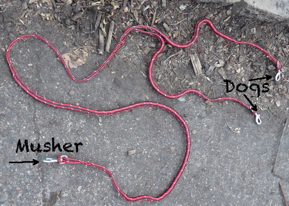 You can see the gangline running from the musher (me) to the leader section, and Pip’s tugline (at his rear) and neckline (at his head) keeping him in position. If I had a four-dog team, there would be another dog mirroring Pip on the other side of the gangline (the red line).