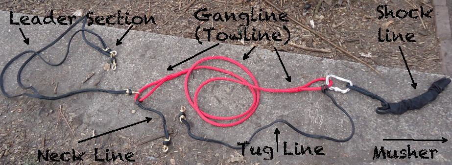 So, I’m dying to get out on my skis. But if I can’t have enough snow to ski and skijor, I guess the next best thing is that what little snow we did have melted completely so that I could sneak in some scootering today. And I decided to experiment with my lines a bit – but before I elaborate I’m going to briefly explain some line terminology so that in case you are even more of a mush baby than I am you’ll know what the hell I’m talking about. People who already know what the hell I’m talking about can skip to the bottom.