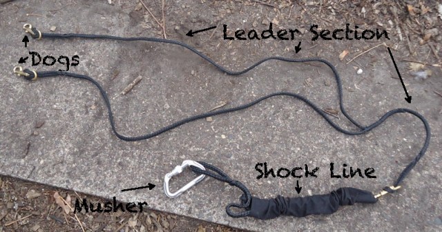 This is about as simple as a line gets – one end attaches to the skier’s skijor belt, and the other ends attach to the dogs’ harnesses. There’s really no way to get confused about this as long as you remember what the numbers “one” and “two” represent. The skijor line contains a lot of bungee (you can kind of see it as the fatter parts of the main line and the Y-sections), which helps absorb the shock of any jolts from sudden movements by either skier or dogs.