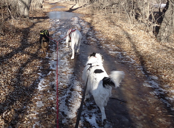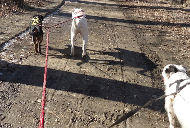 The weird thing is this: I hate running. If I got up off this couch right now and tried to go for a run, it would simply not happen. I don’t think I would make it three blocks before crying UNCLE!. But this morning I packed those dogs up and we played canicross for almost 45 minutes, with me starting out by desperately trying to stick to walking but soon discovering that resistance against three eager dogs is indeed futile. Pretty soon I was jogging, and ended up jogging most of the way, and I loved it.