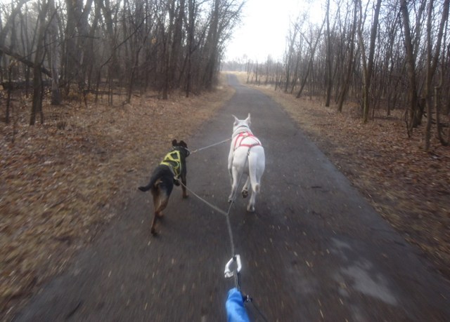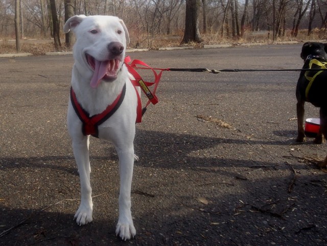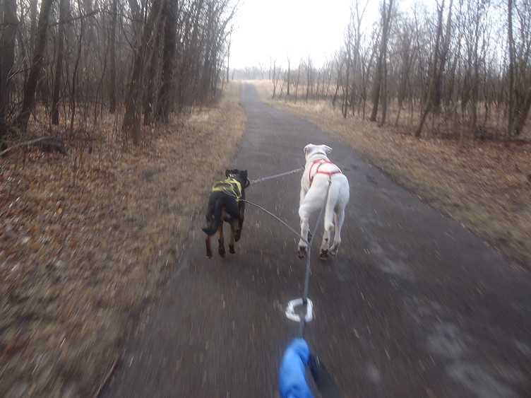 Thanks to daylight savings, we were at the park earlier than usual for scootering and there were turkeys and deer everywhere going on about their usual, unaffected-by-daylight-savings-time morning business. This can be a blessing and a curse – the wildlife is great motivation for the dogs to run and it’s nice to have distractions to train against, but it can make for a wild ride and there’s always the potential for the dogs to get over-the-top excited and out of control. For example, immediately after these pictures were taken (in which, by the way, you will note that Squash has incredibly hunky thighs),