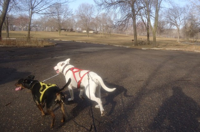 There is a little group of adjacent and partially connected little mini-parking lots at the park where we scooter. Even though I prefer to run the dogs on soft surfaces, I don’t mind pavement for short runs or parts of runs and for training commands. So the plan for today was to use these little parking lots to do some Gee-Haw practice. We did pretty well, I think.