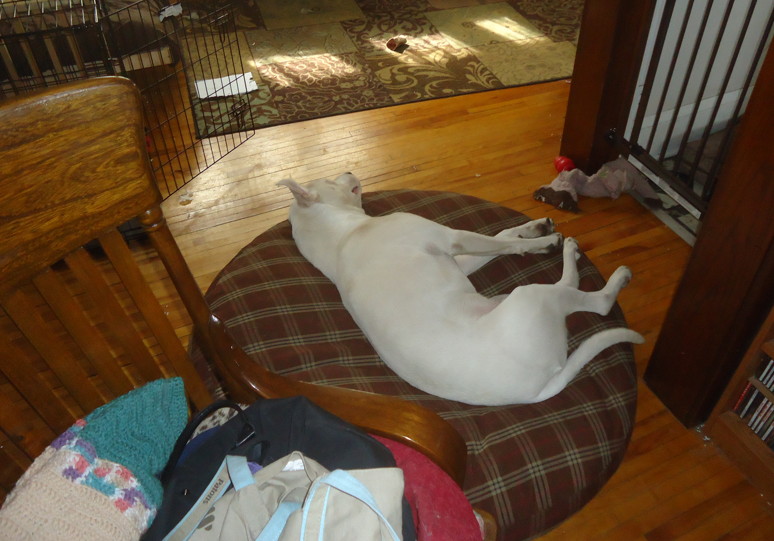 Normally Squash is very busy. He always needs something to do. If he’s not scootering or canicrossing or going for a walk or going to class or chewing on a bone or playing with his ball or barking at the world or rolling around on his back or digging a hole in the yard or playing chase or tug or wrestling with Maisy… that is, if he has utterly exhausted all the other possible ways to fill his day and he simply doesn’t have anything else to do, then he’ll fill his time by pacing around the house. And eventually, he sleeps. Sometimes not until after he’s reached a mental state that is the equivalent of an overtired, overstimulated toddler’s delusional I’M NOT TIRED I’M NOT TIRED mania.