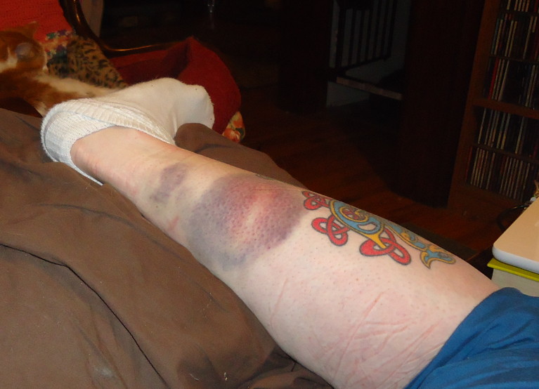I still have a little knot there from the center of that monstrosity, where the edge of the base actually hit me. The edge is surprisingly painful and injurious to be hit by, it’s essentially a skateboard although slightly shorter and narrower, so it’s very hard and somewhat thin which is a rough combination to get hit by. I get little minor bumps from it all the time getting the scooter on and off the back porch and into and out of the car, but nothing like this. That was pretty magnificent if I do say so myself.