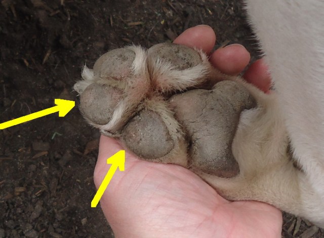 Anyway, here’s the kind of thing I’m looking for. These pads aren’t actually injured, but if we don’t cool it that’s where they could be headed. It didn’t photograph well at all and it’s hard to see, but there are a few round pinkish spots where the top layer of the pad has been a bit worn on two of the toes. I want to stress that he is not limping or painful or having any problems, but continuing to run these paws right now could be bad news. That’s the whole point of checking their feet so frequently, to catch “hey this minor thing maybe could turn into a problem” before it actually turns into a problem.