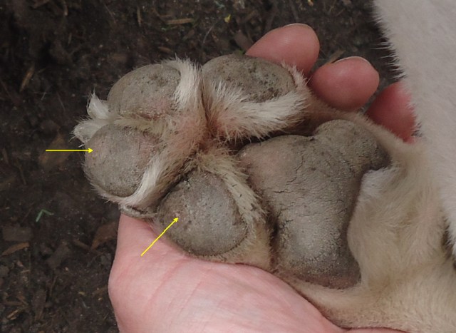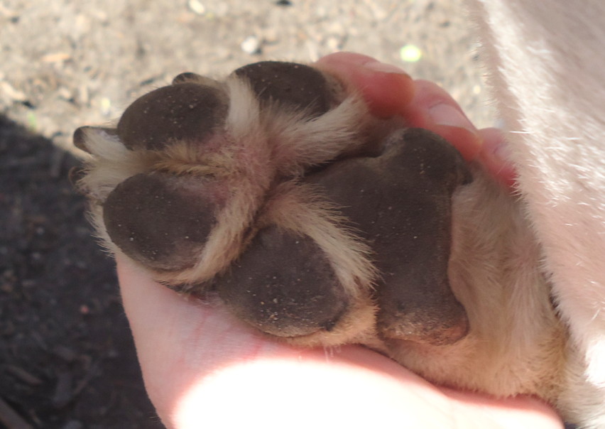 The way this is in the shade, and his pads are a little wet, is kind of reminiscent of late night wrinkle creme “before and after” pictures where someone is frowning and glaring in their before picture and sunshine and roses in their after picture. But, still, you can see those nice smooth uniform pads and the pink circles are gone. BANISHED.