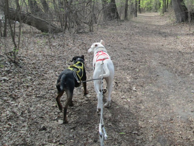 Although he’s still outpacing her. So, we’ll see what happens. For now, I’m stuffing those blue thoughts away into a deep, dark mind crevice while I keep brainstorming. The next thing I’m going to try is using a different sort of collar (thanks to the advice of, once again, Jessica of Blue Eyes and Spitfire) called a limited slip O-ring when they are running. They should feel the pressure of the neckline a bit differently than they do with their regular collars and hopefully alter their paces to stick closer together.