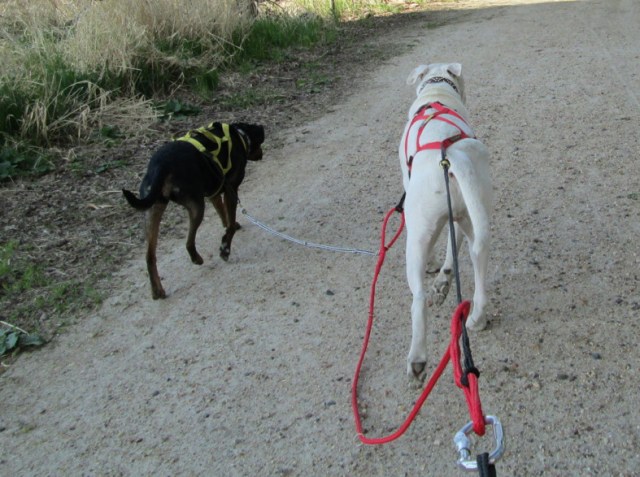 Regular Mush Baby readers (all 3 of you) may remember that when I was getting Pip involved in all this nonsense I purchased a gangline setup meant to add 1-2 dogs behind the leaders. What if, my current brainstorming self got to thinking, I used that setup to line Squash and Maisy up one behind the other instead of side by side. With Maisy in front and Squash behind her, she could set the pace – or at the very least, he wouldn’t be able to totally overtake her and she’d get to run along even if she wasn’t pulling.
