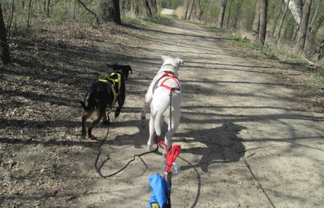 What it means is that Squash has finally gotten interested enough in pulling to outpace Maisy on a regular basis, which makes me happy and sad at the same time. Happy because it means he’s finally approaching something like his full potential. He’s a big, powerful dog, but he’s also an adolescent clown and I’ve struggled with getting him focused enough to be truly serious about pulling. Sad because it makes me think thoughts like, “what will happen if Maisy can’t keep up with him anymore?” and those thoughts take me to a very blue corner of my mind.