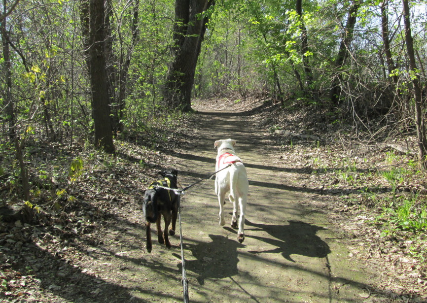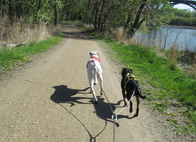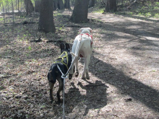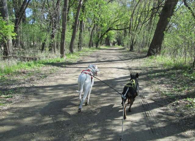 So far things have been going pretty well. Physically, I suspect they are probably capable of far more than I’m asking from them right now, but there’s really no reason to push it. Mentally, on the other hand… since being reassigned to a position that just barely merits being called “lead”, The Boy seems at times to get a little drunk with power. He tends to blast out of the gate at Warp Factor Squash (which admittedly is exciting and exhilarating) but poop out and lose interest further into the run (which is only exciting and exhilarating if you enjoy untangling tangles and practicing starts over and over).