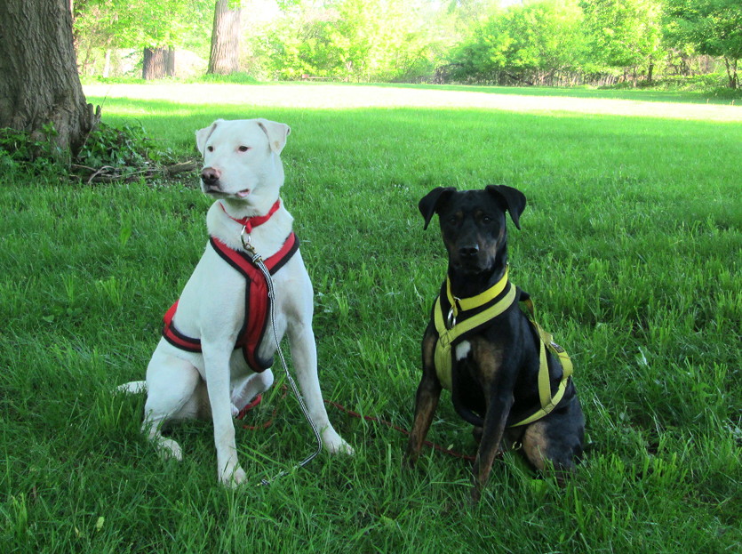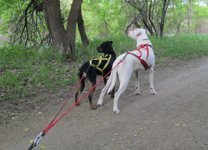 Some geeky stuff… I think this is the new tuglines’ first appearance in the blog. Squash is running with a 55″ tug and Maisy runs with a 40″ tug, which puts her nicely right at his shoulder. I’ve been using one of the longer necklines while they get used to the new tugs, but I think I’ll switch back to the shorter one now that I’m certain Maisy can keep up with this setup. The longer one is too long and is just tangles and armpit-fodder waiting to happen. I’ve also started using the limited slip-collars, which has been generally keeping them a little more responsive to neckline pressure so they get jerked around less (thanks to Jessica of Blue Eyes and Spitfire for that great suggestion, by the way).