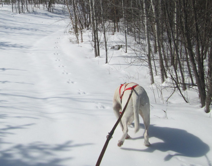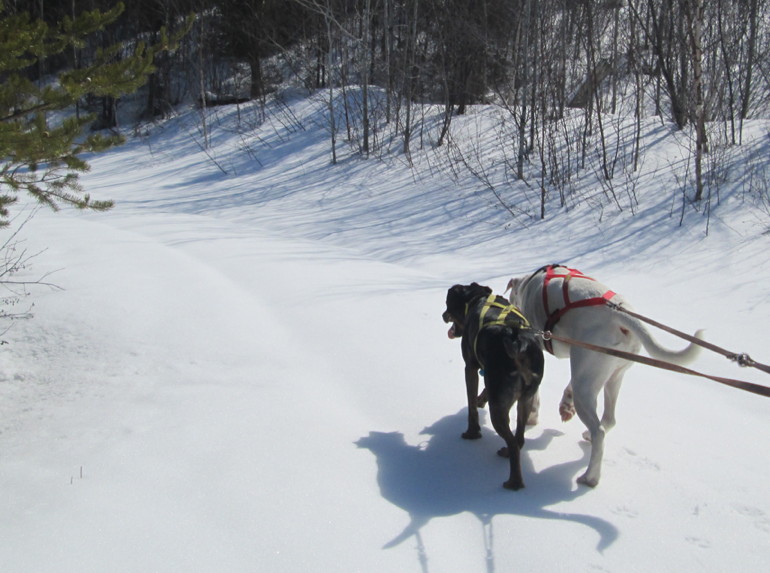 The next day, my enthusiasm undampened but slightly more cautious, I decided to go scout out some of the local trails without the skis at first. This is when I learned that overnight each night, the snow re-hardened enough to form a nice, solid surface to hike or ski on – but only if we got up early enough to beat the slush. By the time we finished this hike we were already falling through the softening snow, so we didn’t do any skiing but did get a lovely hike in. (I almost always “walk” the dogs in harness and with the skijor belt these days, which I suppose is technically canicross.)