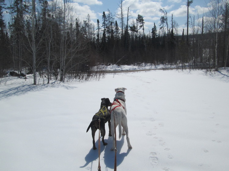 But just when it seemed that the skis would be relegated to the back porch until next year, spring in Minnesota reminded us that it is a capricious beast. And apparently in 2013 it went all out in hopes of winning some kind of Most Fickle Season award. Snowstorm after snowstorm had already happily extended the skijoring season past its natural expiration date, so when I was packing for our spring vacation up north I went ahead and threw the skis in the car even though I expected to mostly be scootering as a repeat of our fall mushing vacation, and Fickle Spring did not disappoint.