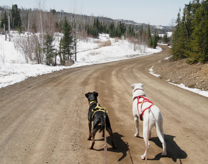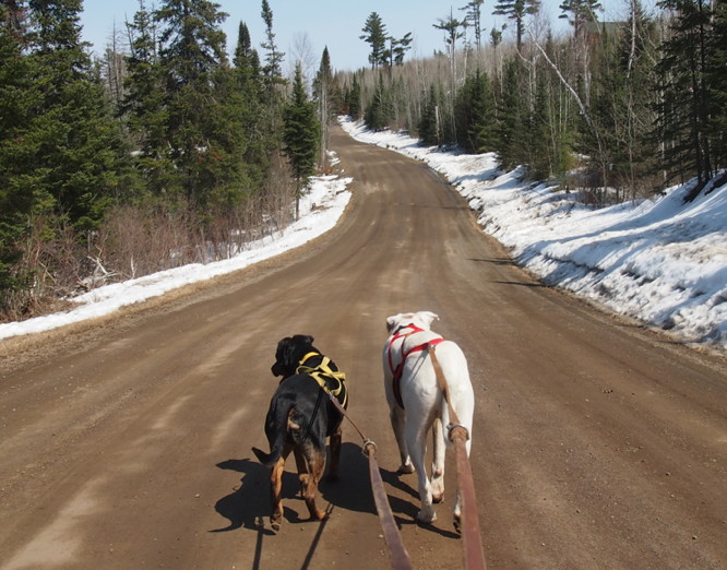 In the weeks following my last post, enough snow eventually melted to break out the scooter for a couple of runs. Although the dirt trails were still way too muddy for the scooter (deep, sucking, wheels-can’t-turn muddy rather than simply messy muddy, which I can deal with), the roads were clear. Since we were limited both in where we can go and how much running I want them to do on pavement, it was a good time to ease into dryland training with a bit of nice easy gee-haw practice in some perfectly convenient interconnected parking lots.