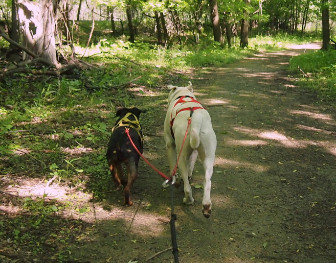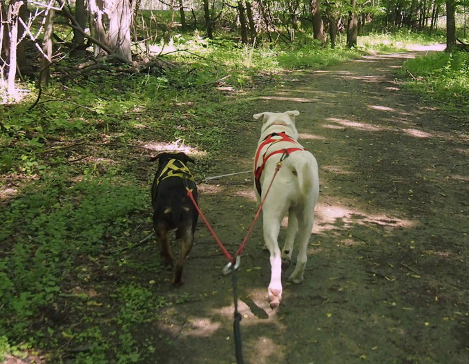 Maisy doing all the work, and slack in Slacky McSlackerton’s line. This spring it’s been frustratingly consistent, which makes me pause and think about whether there is some physical issue going on. The way he gallops after deer and around the backyard, as well as the fact that this has been an issue of varying degree since… well, forever… makes me think probably not, but just in case the dogs both have an evaluation scheduled with a veterinary physical therapist in a week or so just to make sure everything is ship-shape with them.
