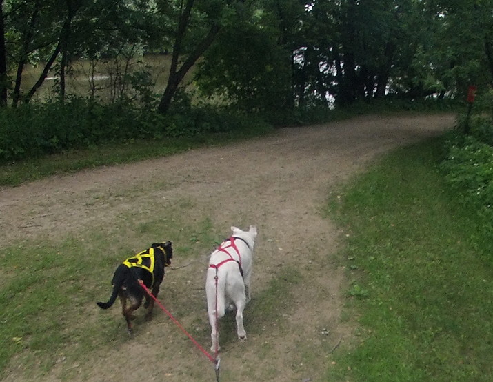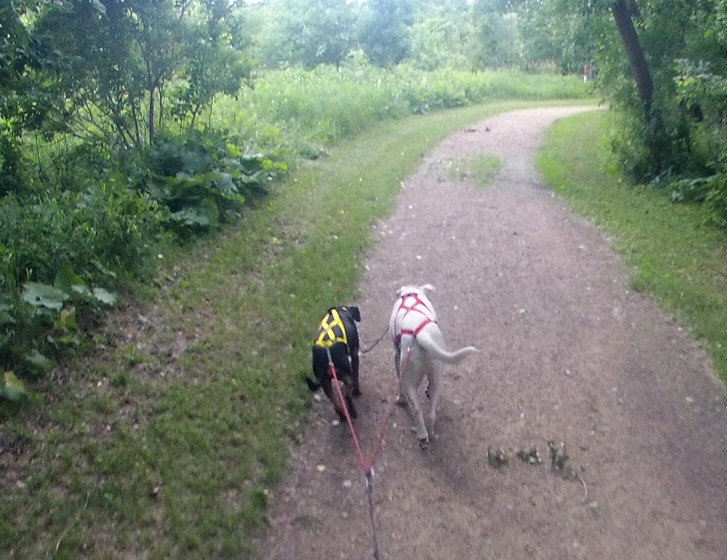 The last time we had gone scootering, I had just had the idea to lure Squash back into the tight tug club by swapping out his slightly longer line for Maisy’s slightly shorter line, but we’d really only had one run to try it. Yesterday it seemed to work quite well. Maisy ends up with a little slack in her line from time to time, but I think it’s because she’s consciously or unconsciously maintaining their relative positions she’s used to. When I notice it and brake to take up her slack, she seems to “get it” and adjusts to keep her line tight.