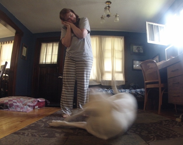 Anyway, here is where I am going with this: An awful lot of our time these days is spent doing what a lot of people (sadly, including a lot of Very Serious trainers) consider completely useless. Close the drawer. Ride the skateboard. Jump over my back. Weave through my legs. But fast forward to today and I have two dogs I am trying to do a variety of physical therapy exercises with and it turns out that some of the absolutely most useful things Squash knows that makes these exercises easier are “silly” tricks: ARE YOU TIRED? (BANG, YOU’RE DEAD for people who didn’t take their tricks classes from a pacifist), TOUCH, and ROLL OVER.
