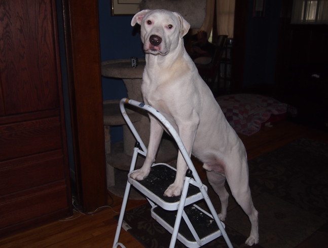 Another of their exercises is this simple stretch. Once I put this stool out, it took Squash about two minutes to figure out what I wanted him to do with it.