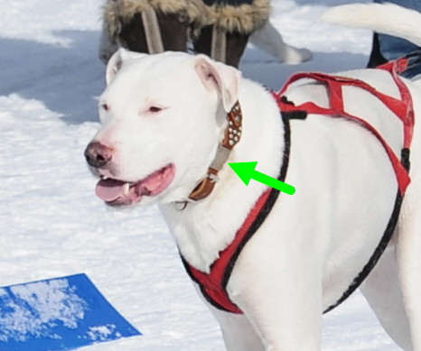 This Wednesday’s What I Like is a pretty basic but very important item: The collar tag, an identification tag that does NOT dangle off the collar and therefore is in no danger of getting tangled up with any of the lines when you’re running dogs. When I run both dogs together, I have them in limited slips (which will be the subject of a future WILW) with name and phone number embroidered directly on the collar so there is no need for tags at all. But when I run them individually I might use any one of a number of collars; and since I am a collar junkie, at races I like to use some of Squash’s fancier collars and that is where the collar tags come in.