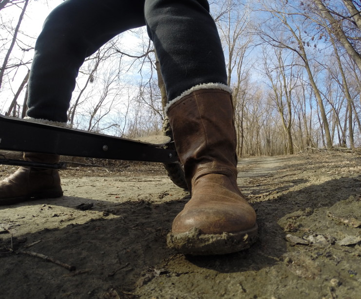 It was a little bit muddy in some stretches, but not too bad. Just enough to mean I had to kick and run the scooter more than usual and make them work a little harder, but not enough to make it impossible or frustrating for them. When it is dried out, it will be perfection.