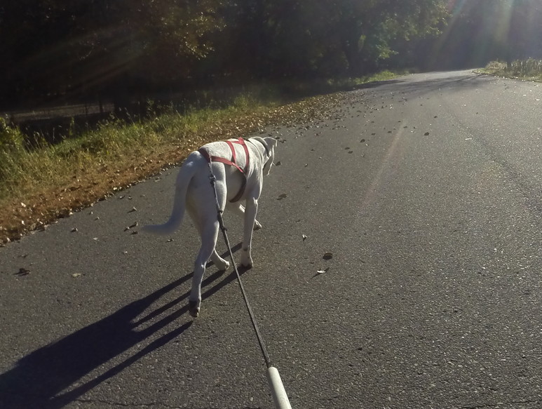Squash and I have been taking baby steps towards scootering together without Maisy while she recovers. My immediate goal was to make one full loop with him around the road we’ve been training on without stopping. A year ago I would have thought this an impossible dream.